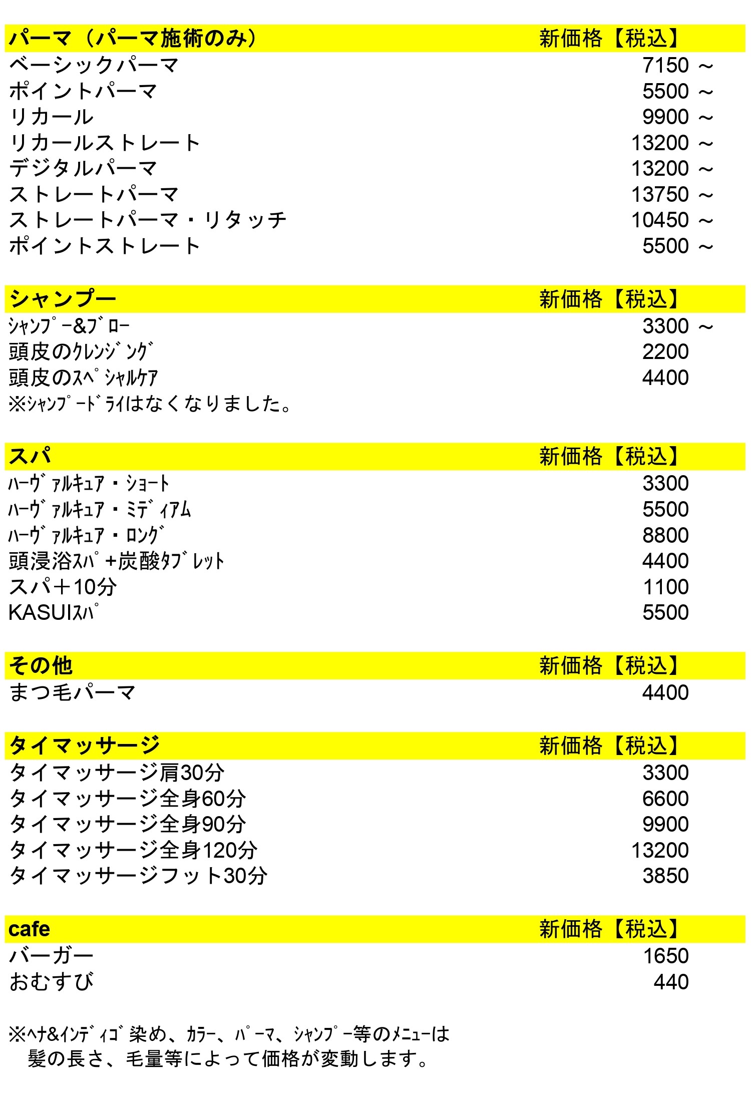 価格改定メニュー